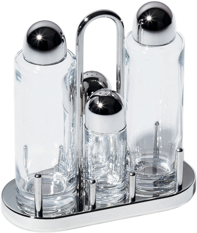 Elle possède 4 pièces permettant de recevoir sel, poivre, huile et vinaigre.