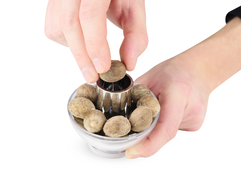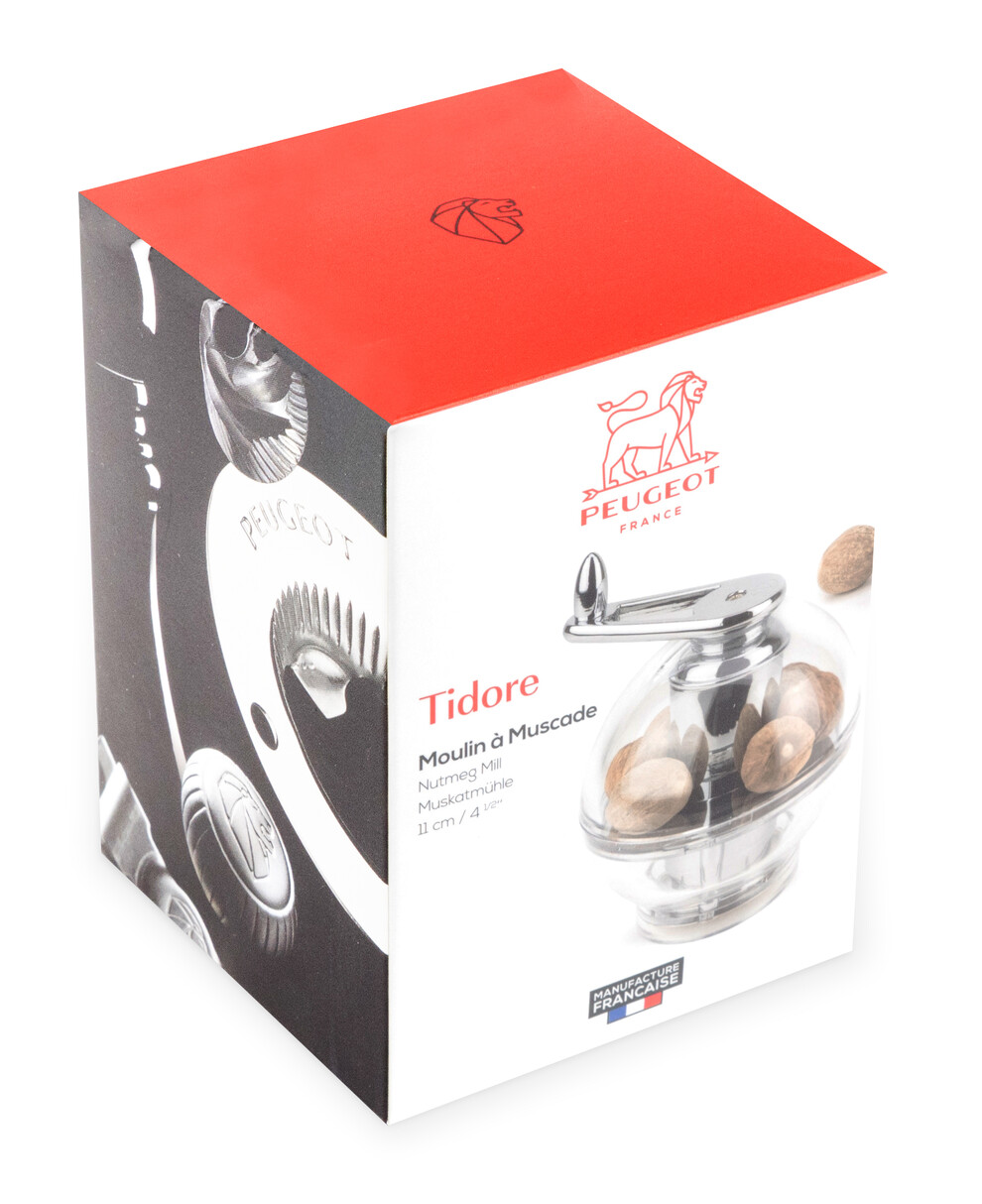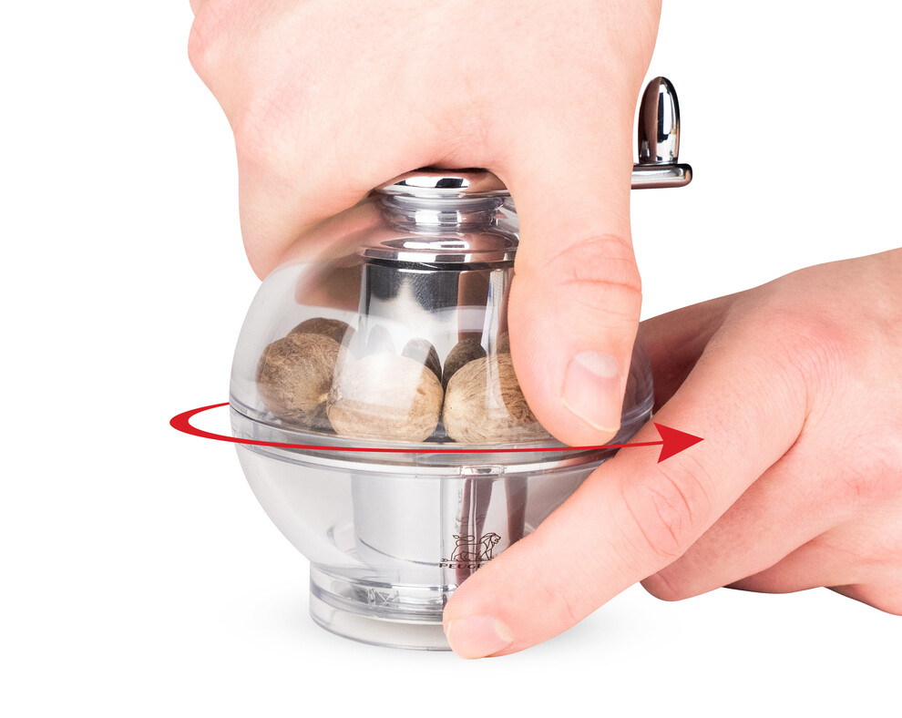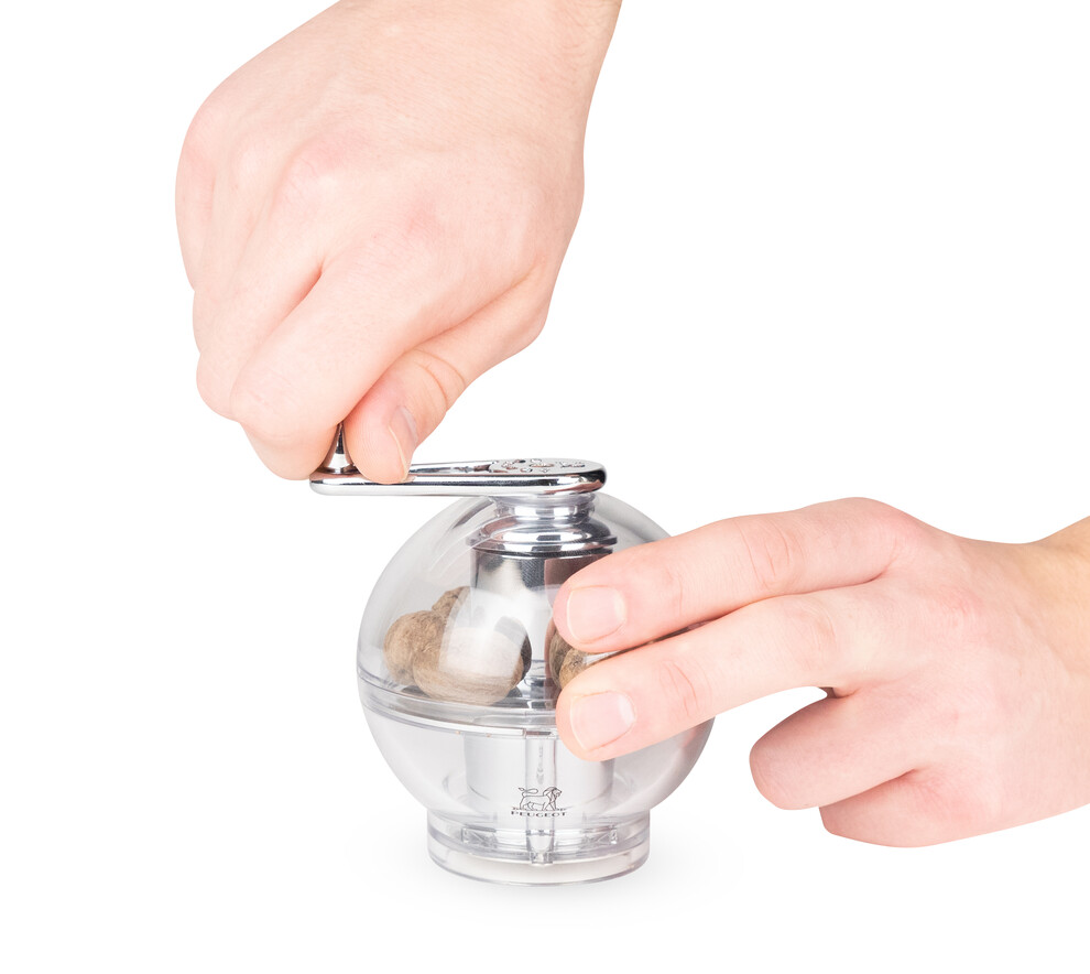 Avec le moulin à muscade Peugeot "Tidore" cette pincée devient ingénieuse. Sa griffe puissante et son duo lame-râpe tournant permettent de très finement la noix de muscade, sans risque pour vos doigts. Bien pensé, il est équipé d’un réservoir qui permet de conserver à l’abri 7 à 8 noix. Son design tout en rondeur évoque les courbes d’une noix de muscade.