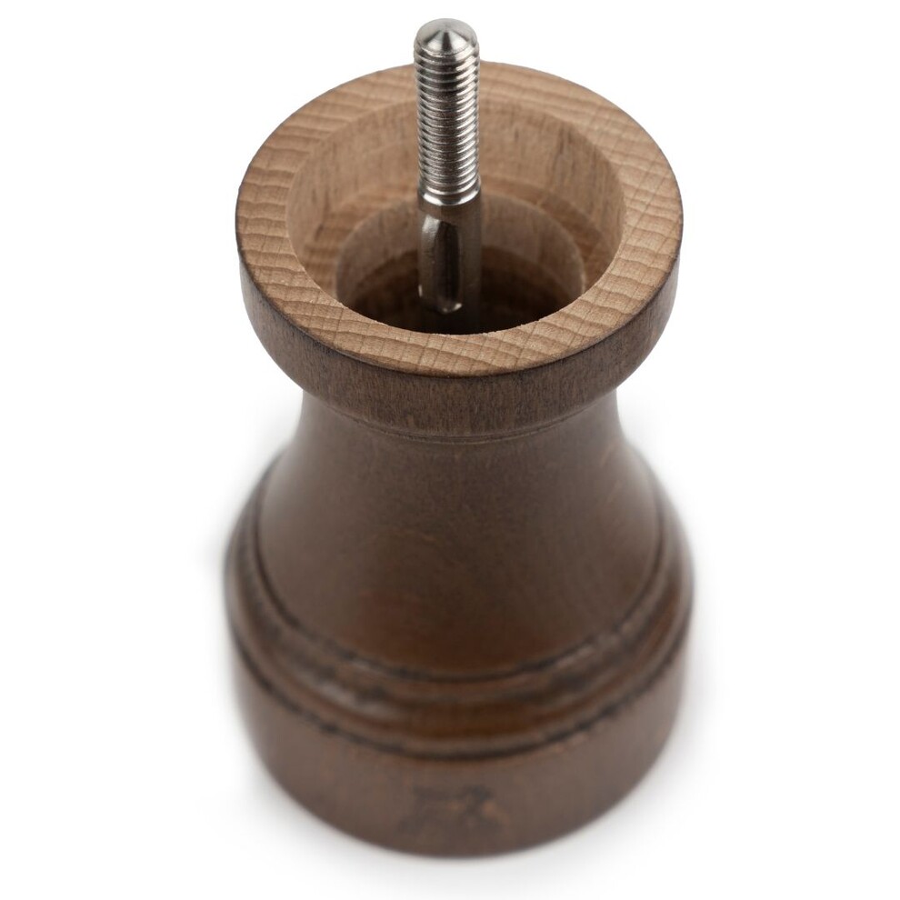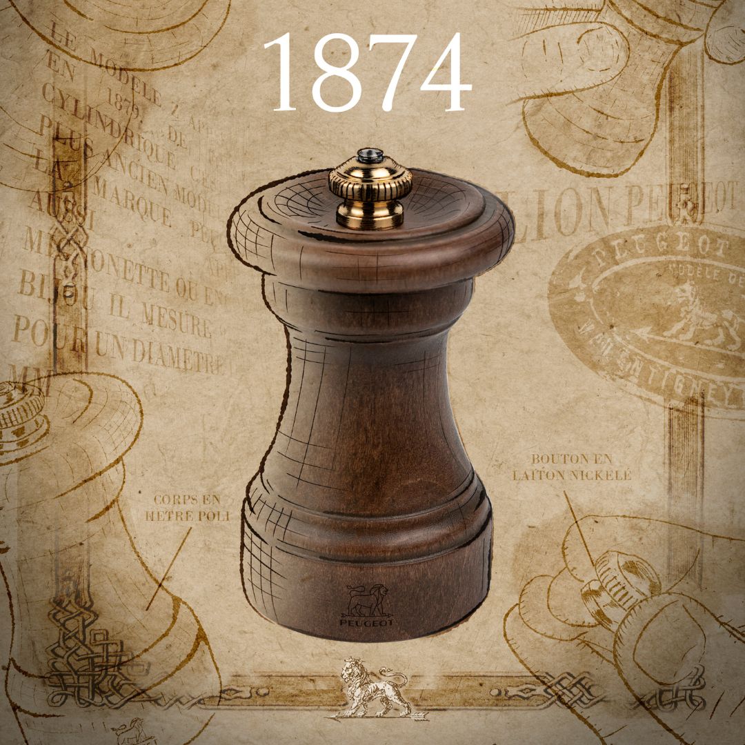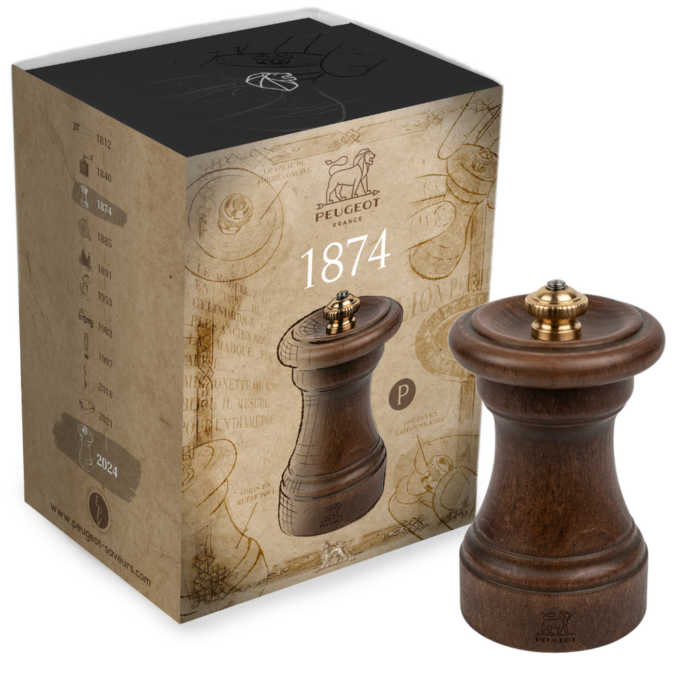Fabriqué en hêtre avec une finition patinée, le moulin "1874" est présenté dans un élégant coffret. Il est soigneusement protégé par un sachet en feutrine, offrant protection et charme intemporel. Son bouton bijou, reproduit fidèlement à partir de l’original, apporte une touche d’élégance et souligne la silhouette courbée de son chapeau emblématique.