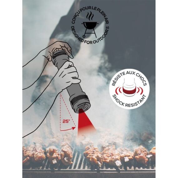 L’éclairage LED se déclenche automatiquement par inclinaison du moulin de 25° et s’éteint progressivement, lorsque le moulin revient en position verticale. Il vous assure une longévité d’au moins 20 000 utilisations avant changement des piles. Un moulin fait pour les amateurs de barbecue !