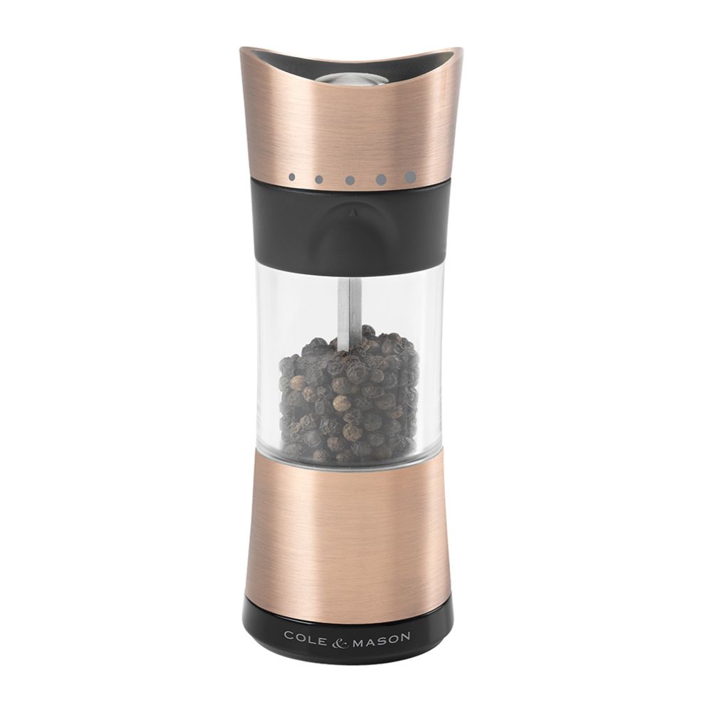 Le Moulin à poivre Horscham cuivre 15,4 cm de Cole & Mason a un design unique en cuivre lui donnant élégance et modernité saura parfaitement trouver sa place dans votre cuisine. Il dispose du mécanisme de précision qui coupe le poivre pour permettre une plus grande libération d'arôme. Le mécanisme est conçu pour l'assaisonnement professionnel et la création de la saveur ultime pour vos plats. Avec sa conception en acier au carbone trempé ce moulin dispose du meilleur mécanisme disponible. Le mécanisme à ressort permet un réglage facile entre les broyages fins et grossiers. Il y a 5 réglages de broyage préréglés pour le poivre. Le broyage supérieur du poivre fournit plus de matière à chaque tour. Le moulin a une forme inversée pour garder votre plan de travail propre.