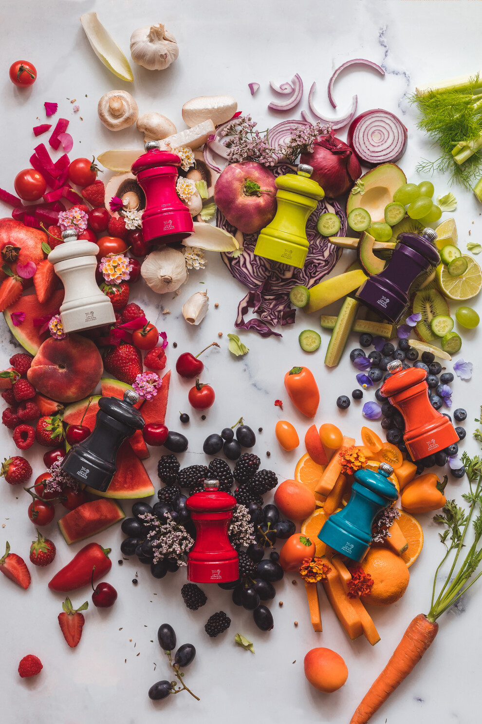 Ces 8 couleurs sont déclinées à la fois en moulins à poivre et à sel et offre une combinatoire de 64 compositions différentes, permettant ainsi de composer son propre duo, monochrome ou bicolore.