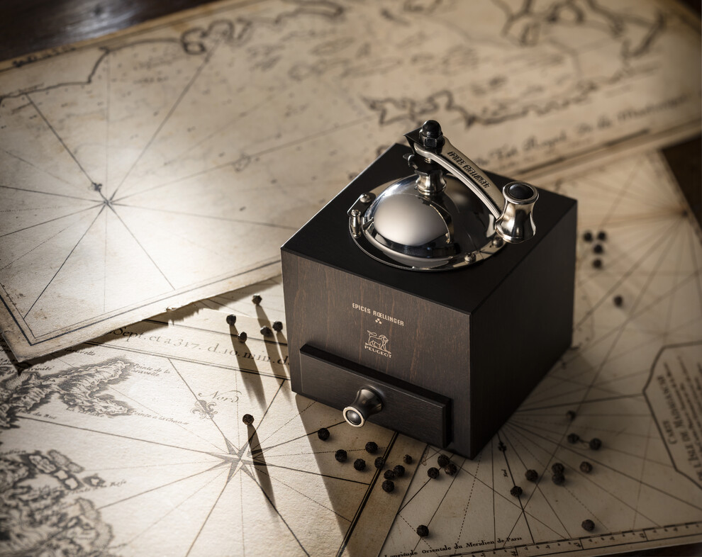 Coup de cœur du chef spécialiste des épices Olivier Roellinger, le moulin à poivre Roellinger Chocolat de Peugeot s’inscrit dans la tradition des premiers moulins à épices.
