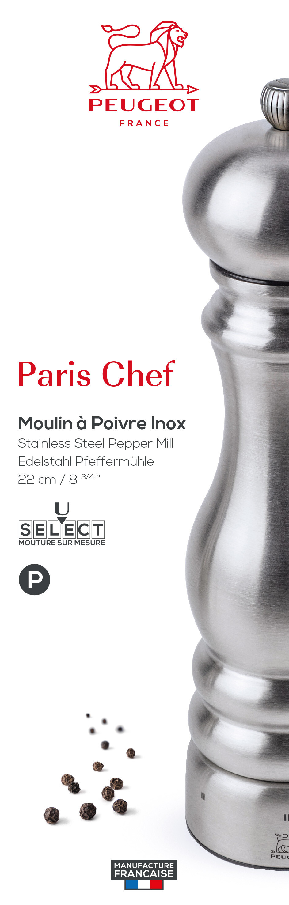 Tous les mécanismes Peugeot sont garantis à vie et offrent une grande robustesse. Le moulin à poivre Paris Chef U’Select est garanti 5 ans.