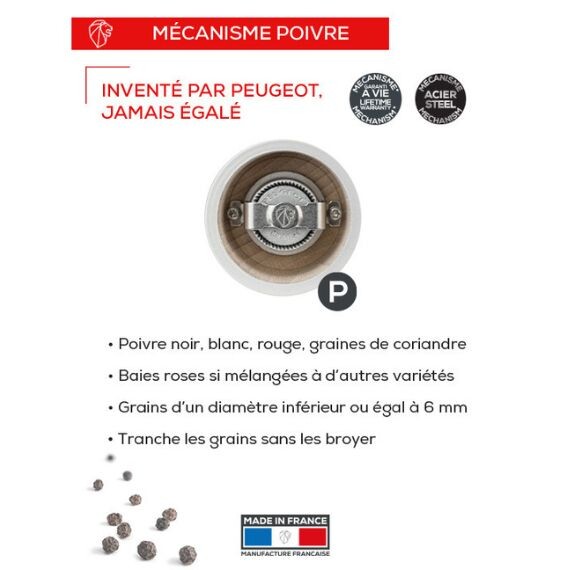 Fabriqué au coeur de la Franche Comté, la collection Bistrorama respire la France. Ces moulins laqués, fabriqués en bois de hêtre géré durablement, sont équipés du mécanisme Peugeot, garanti sans limitation de durée.