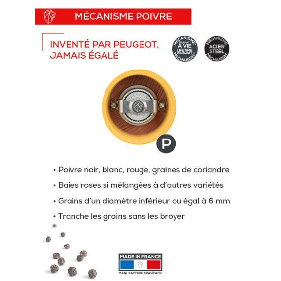 Fabriqué au coeur de la Franche Comté, la collection Bistrorama respire la France. Ces moulins laqués, fabriqués en bois de hêtre géré durablement, sont équipés du mécanisme Peugeot, garanti sans limitation de durée.