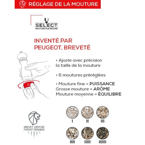 Le moulin Paris bois est équipé du système U’Select breveté par Peugeot qui permet de sélectionner six degrés différents de mouture. Du grain concassé au sel le plus finement moulu, vous gardez la main pour adapter la finesse du grain aux recettes que vous souhaitez exécuter.