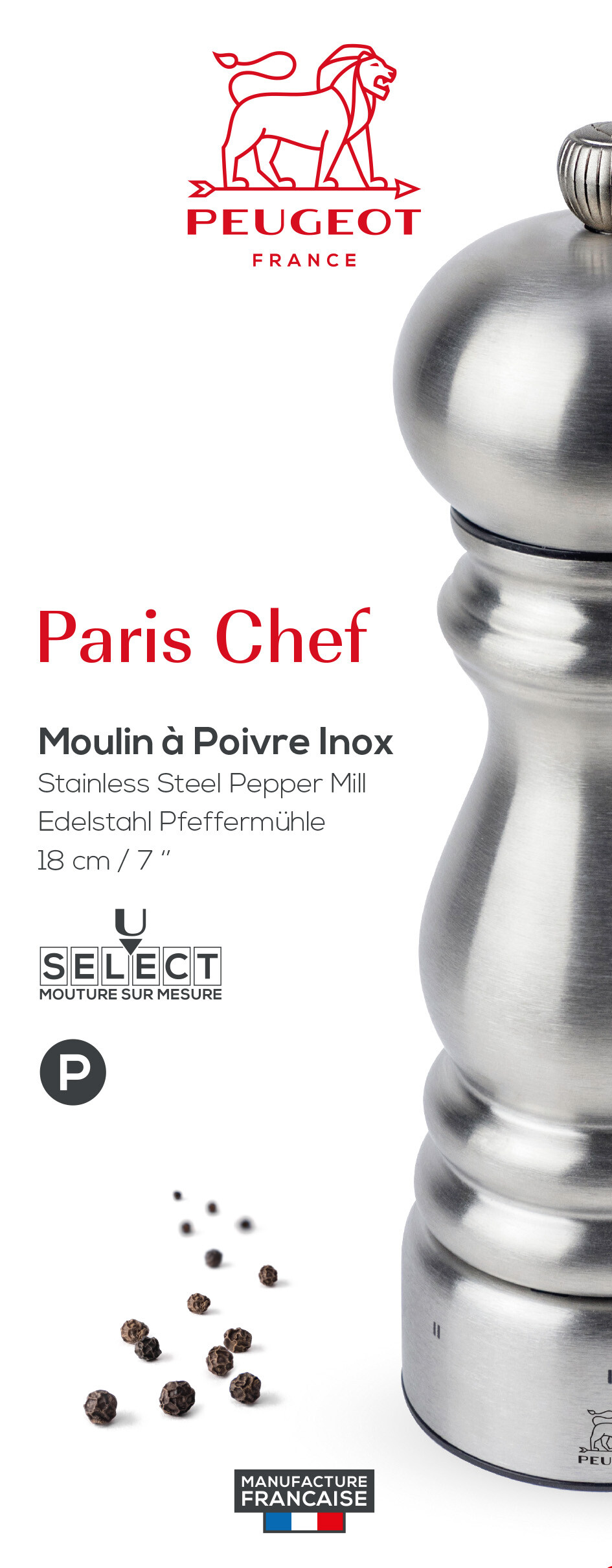 Tous les mécanismes Peugeot sont garantis à vie et offrent une grande robustesse. Le moulin à poivre Paris Chef U’Select est garanti 5 ans.