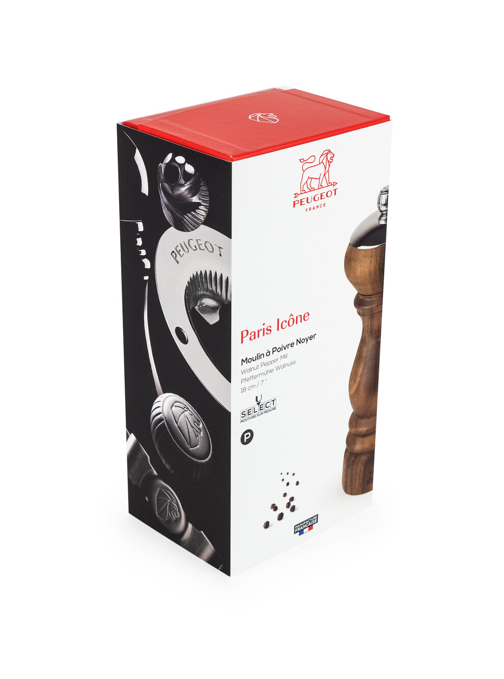Retrouvez la forme emblématique des moulins Peugeot avec le moulin à poivre Paris Icône : retravaillé, il dispose d'une coupelle en acier qui vient embellir son corps en bois précieux de noyer.