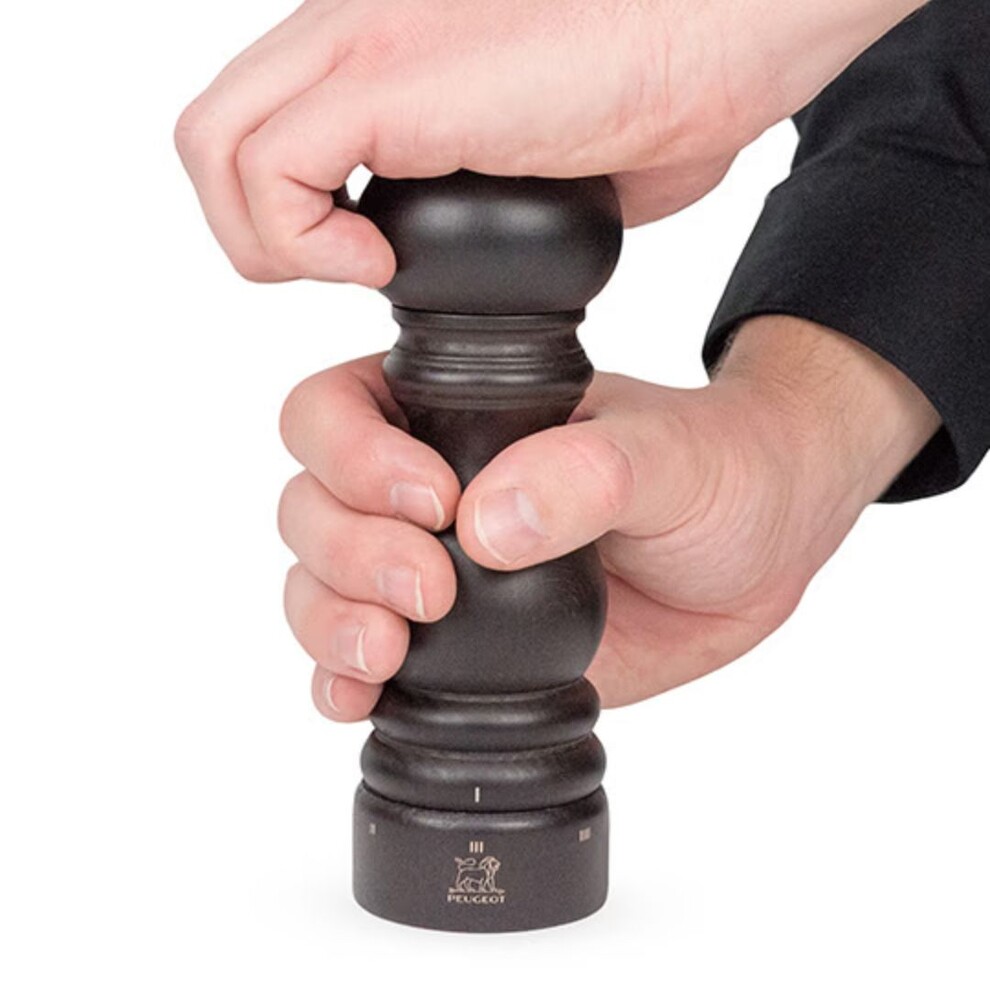 Modèle emblématique de Peugeot, le moulin à sel manuel Paris U’Select 18 cm en bois de hêtre noir Chocolat allie simplicité et technicité.