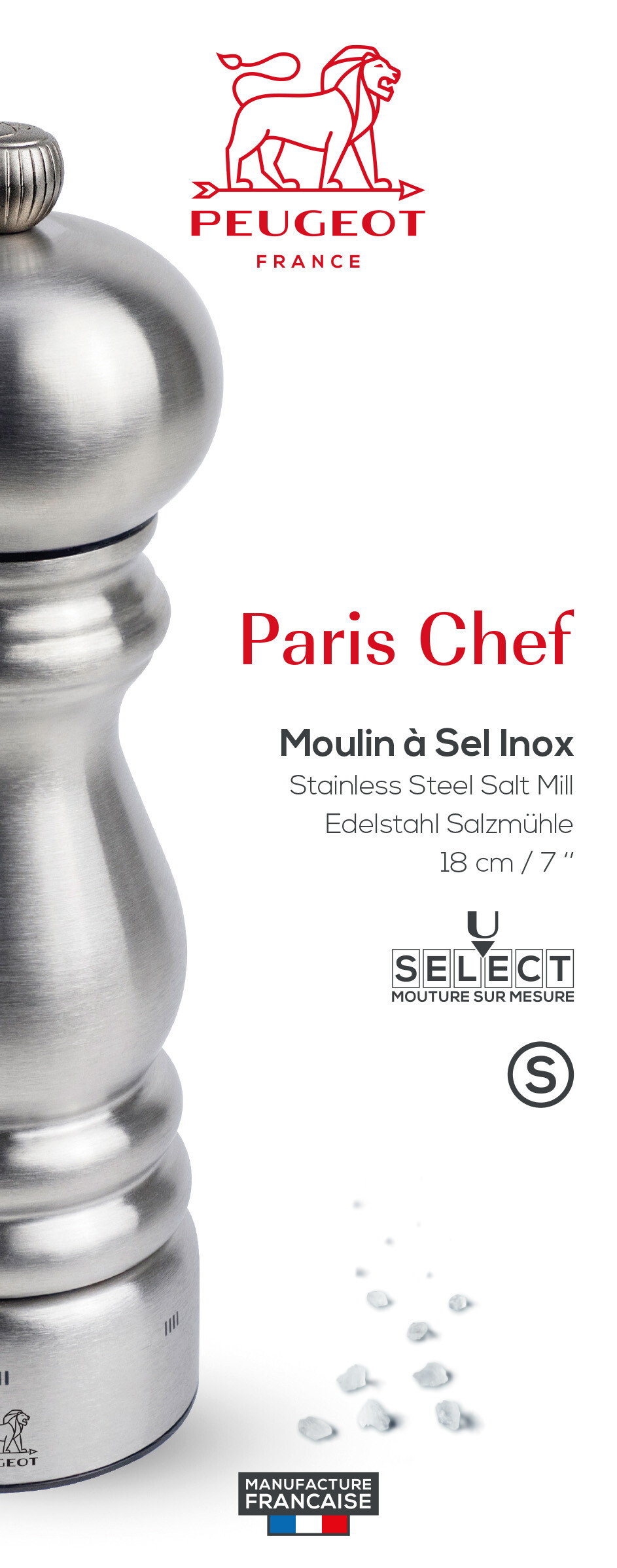 Tous les mécanismes Peugeot sont garantis à vie et offrent une grande robustesse. Le moulin à sel Paris Chef U’Select est garanti 5 ans.
