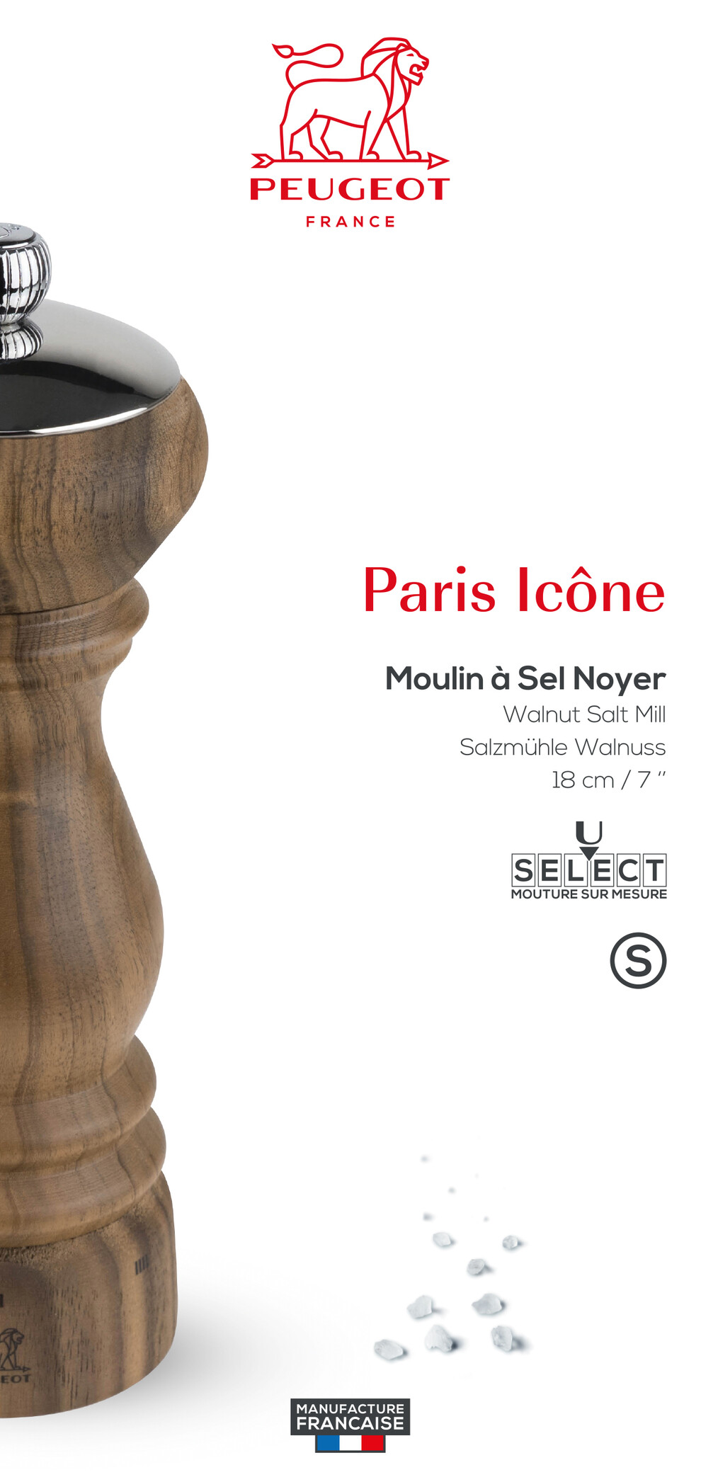Retrouvez la forme emblématique des moulins Peugeot avec le moulin à poivre Paris Icône : retravaillé, il dispose d'une coupelle en acier qui vient embellir son corps en bois précieux de noyer.