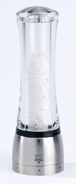 La suppression de l'axe central prend tout son sens, rien ne venant troubler l'esthétique de l'objet dont le réservoir laisse apparaître les grains de sel .