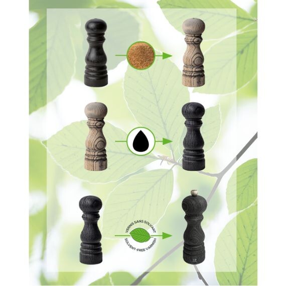 Le moulin à sel Paris Nature 18 cm est unique. La conception du moulin Paris Nature a été intégralement imaginée dans une démarche environnementale et d’économie des ressources. Certaines pièces de bois sont écartées lors du cycle de production des moulins Peugeot, car elle laissent apparaitre des taches ou de légères imperfections visuelles. Ces pièces, dont les qualités intrinsèques restent intactes, sont recyclées. Les coquilles de noix sont broyées et offrent une texture inédite et un aspect unique au moulin.