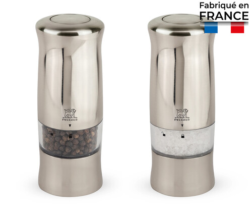 Le coffret Zeli de Peugeot rassemble le moulin électrique à sel et le moulin électrique à poivre Zeli coordonnés.