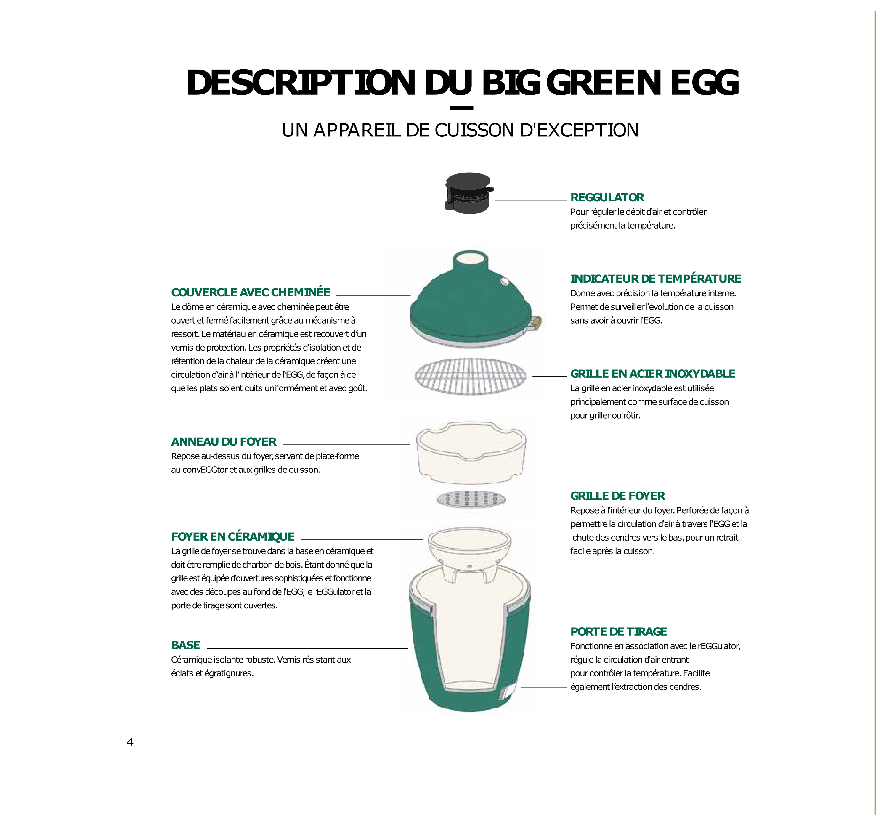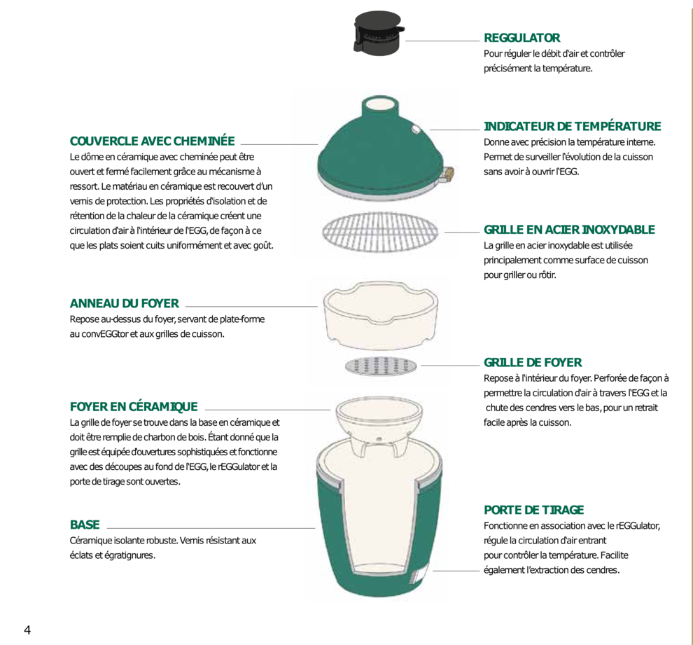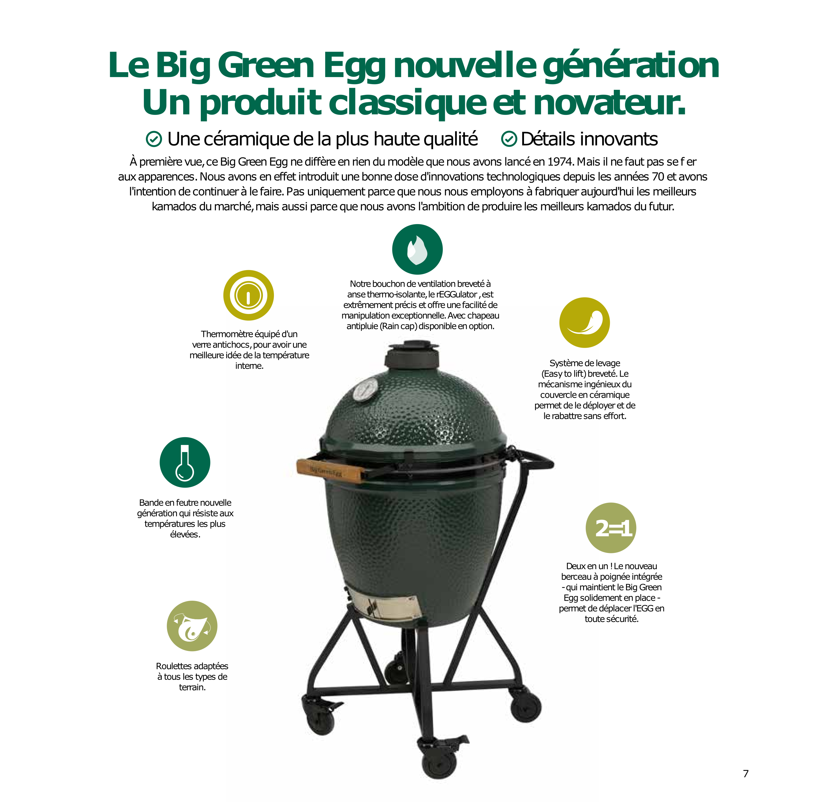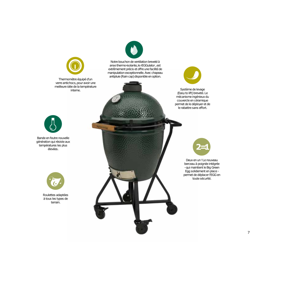 Vous l'aurez remarqué : le Big Green Egg a un design peu commun. Au premier coup d'oeil, il intrigue et ne laisse pas indifférent. Sous sa forme amusante de gros oeuf vert, se cache un ustensile complet, ingénieux et très résistant.