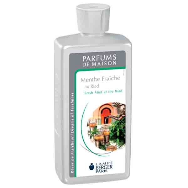 Le parfum de maison pour lampe Berger « Menthe fraîche au Riad » est composé de jasmin, bois fumés, feuilles de menthe, thé vert, citron et cardamone.