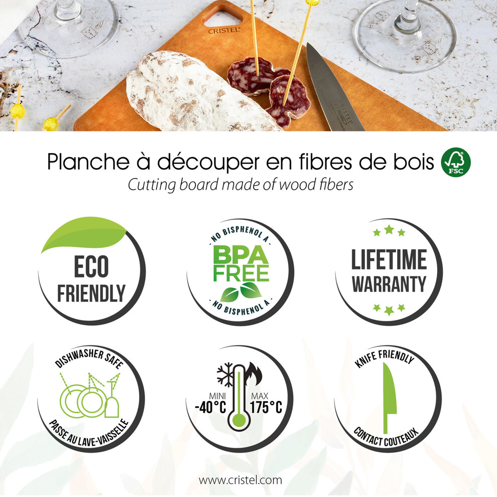 Préservant l'environnement et étant certifiées FSC, Cristel réalise des planches à decouper en fibre de bois compactée.