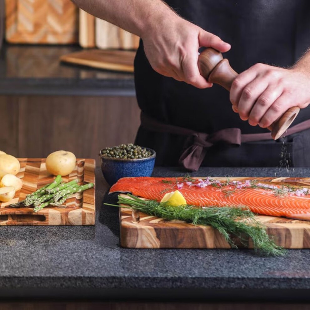 Pour une planche à découper aussi belle que pratique, jetez un œil à cette planche à découper en teck à chevrons de la marque Teakhaus.
