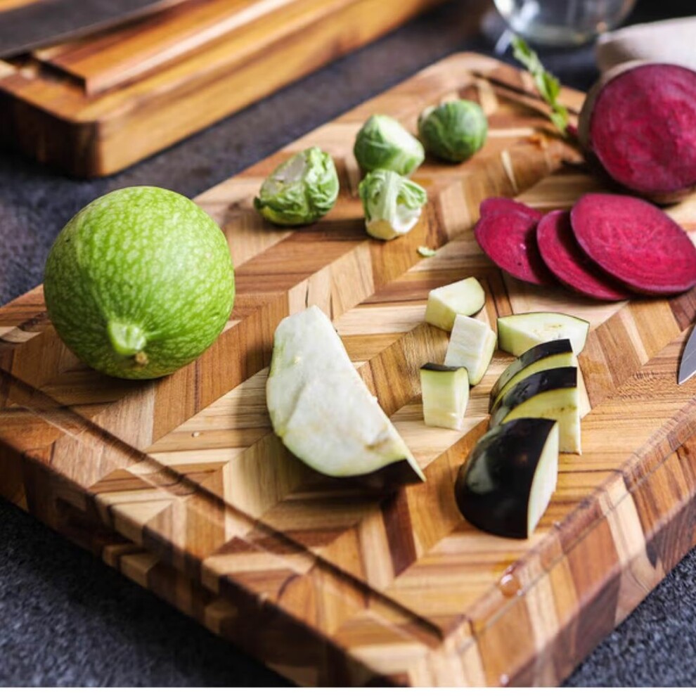 Pour une planche à découper aussi belle que pratique, jetez un œil à cette planche à découper en teck à chevrons de la marque Teakhaus.