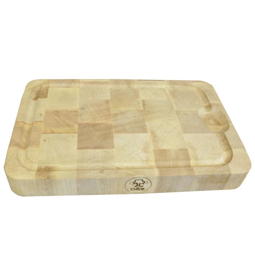 Ce plateau de découpe en bois de bout double face réversible avec sa rigole ramasse jus, est idéal pour accueillir volailles, rôtis et gigots tout juste sortis du four. Vous pourrez également travailler tous les morceaux de viande crus avec la même dextérité que sur un étal de boucher. Chocs et coups de lame n'entameront jamais le bois de cet article d'exception dont l'esthétisme n'enlève rien à l'extrême robustesse. Chaque produit Chabret est fabriqué artisanalement avec du bois français sélectionné dans les plus belles forêts du Jura. L'utilisation de l'hêtre en bois de bout garantit une résistance totale aux coups de lame. La planche ne se fend pas et ne marque pas. Elle reste totalement lisse année après année, ce qui garantit des conditions d'hygiène parfaites en totale conformité avec la norme NF Alimentaire.