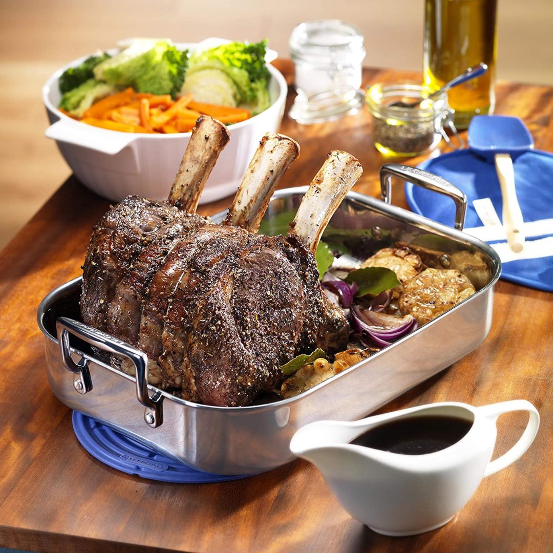 Le plat à rôtir en inox de la marque Le Creuset , parfait pour faire rôtir vos viandes, poissons, ou légumes.