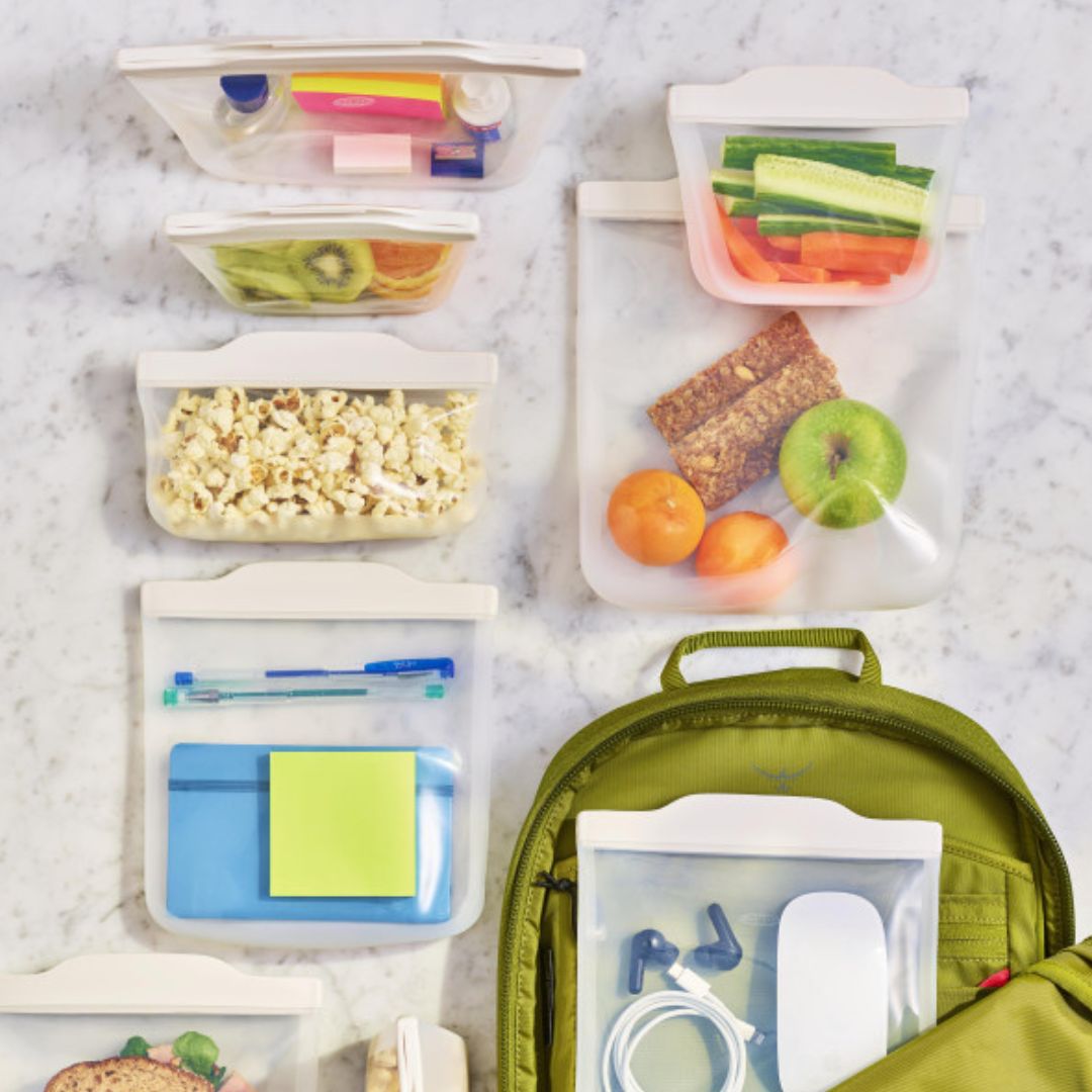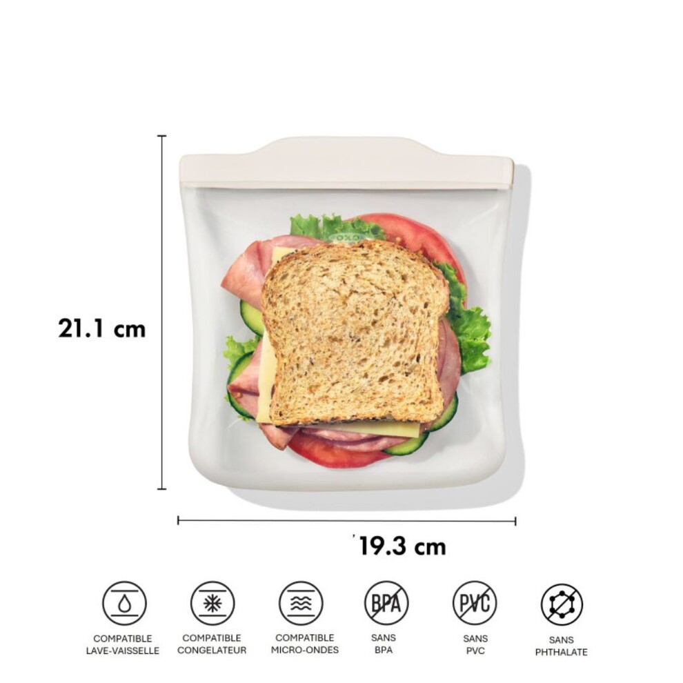 Idéale pour les lunchs, pique-niques ou encas, cette pochette plate et empilable se glisse facilement dans un sac.