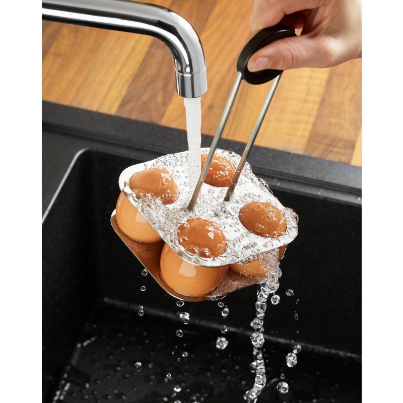 Grâce à ce support à pocheuse Gefu en acier inoxydable de haute qualité et nylon, vous pouvez pôcher jusque 4 oeufs à la fois en toute simplicité.