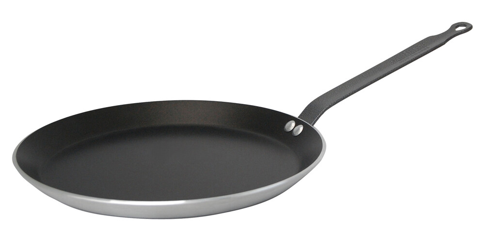 Poêle avec une jupe basse parfaite pour la réalisation de crêpes et permettant de les retourner facilement grâce à ses propriétés antiadhésives.