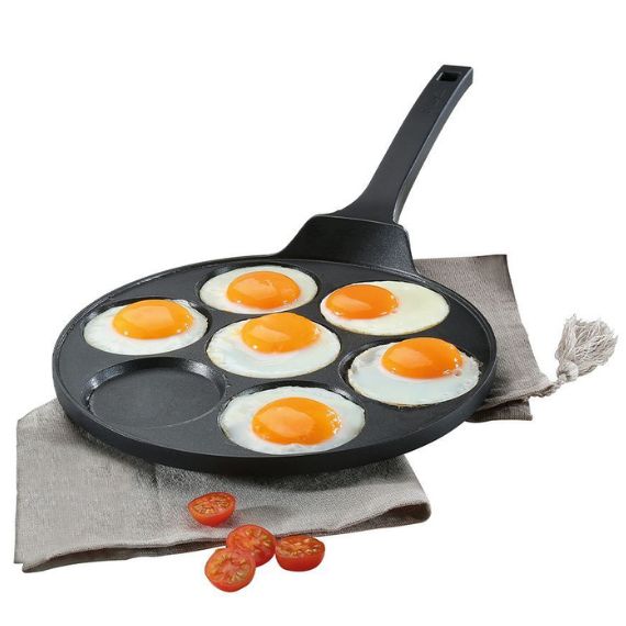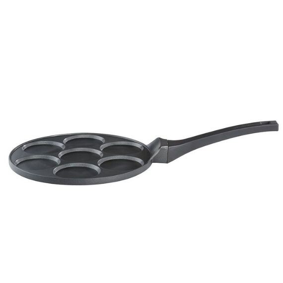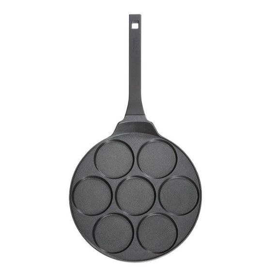Cette poêle en aluminium forgé est idéal pour une friture rapide. Grâce à la conductivité thermique, la chaleur se répartie uniformement dans tout le corps de la poêle. Elle est également dotée d'un revêtement antiadhésif à haute performance. Vos pancakes ne colleront pas ! Les 7 cavités de 8 cm de diamètre sont idéales pour la préparation de pancakes, d’œufs au plat ou d’autres plats à base d’œufs. Manipulez votre poêle en toute sécurité avec la poignée ergonomique en plastique.