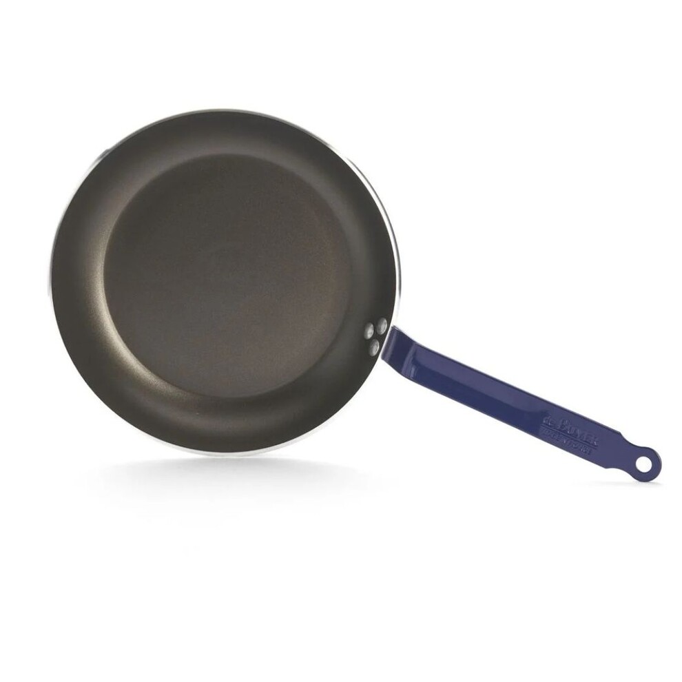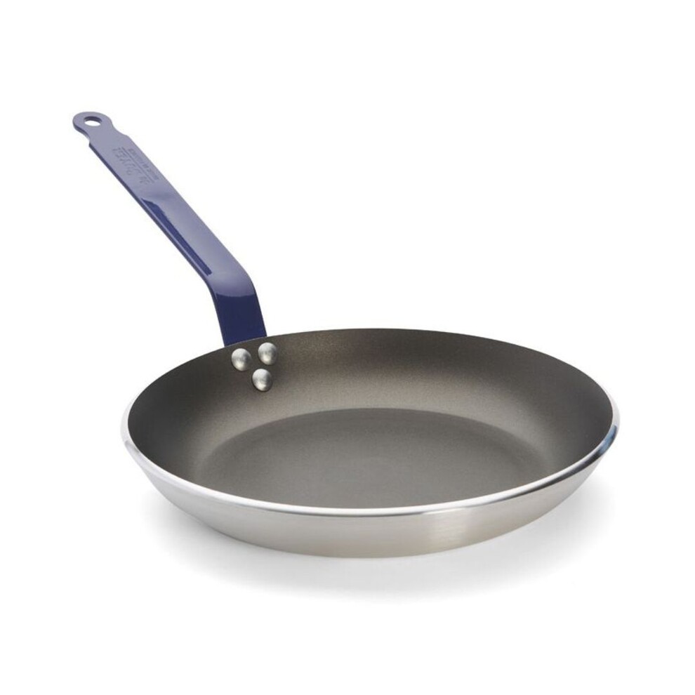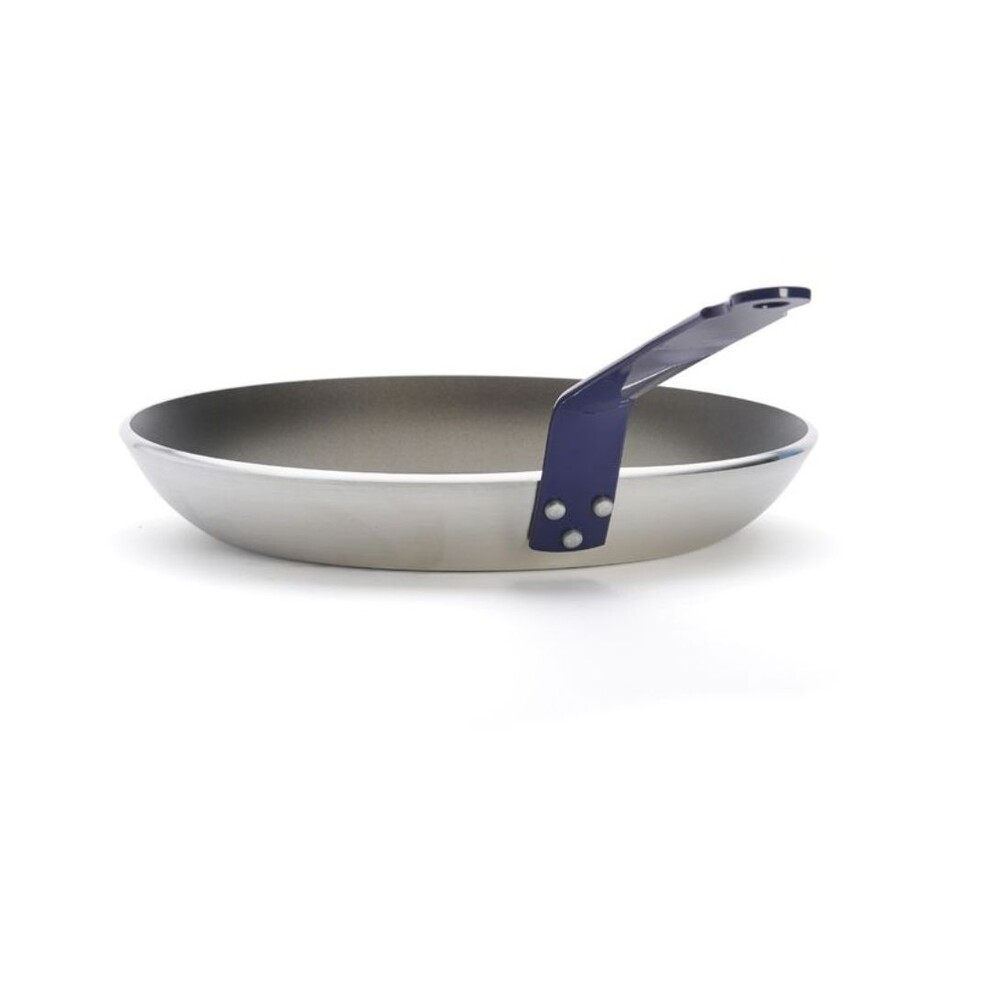 Le manche bleu indique que la poêle est recommandée pour la cuisson des poissons; il est fait d’un époxy résistant au flash four (10 min, 200°C). Riveté, il est indémanchable et sa courbure à la française rend la manipulation facile.
