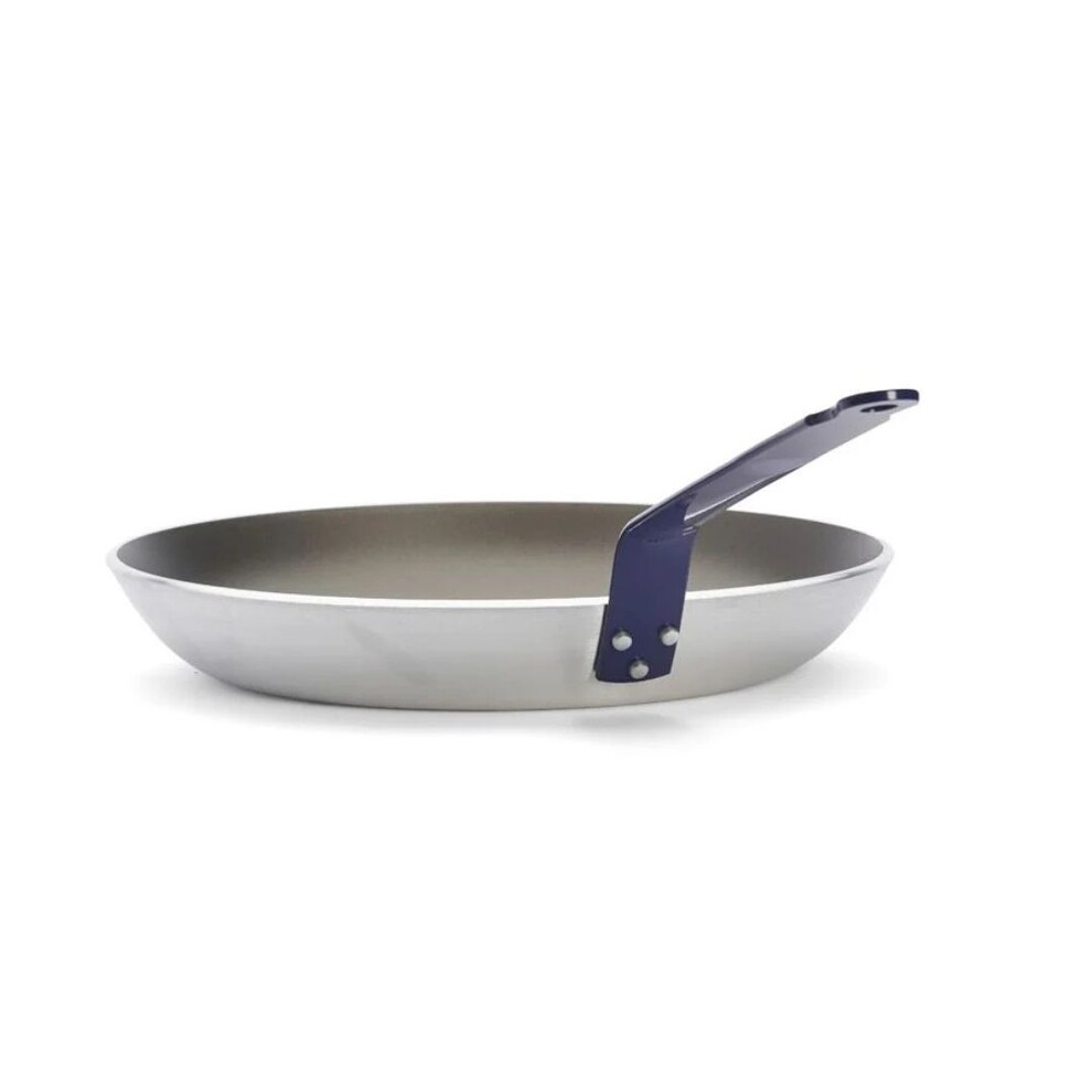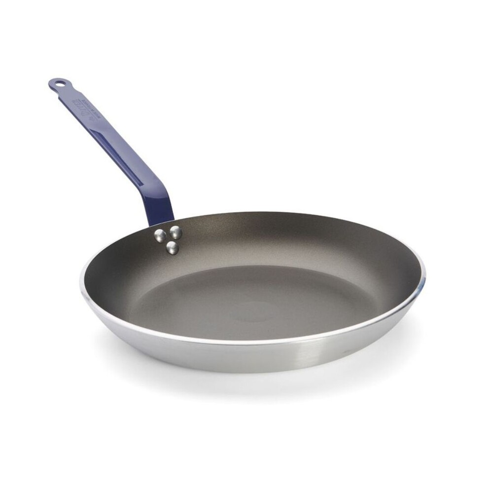 Le manche bleu indique que la poêle est recommandée pour la cuisson des poissons; il est fait d’un époxy résistant au flash four (10 min, 200°C). Riveté, il est indémanchable et sa courbure à la française rend la manipulation facile.