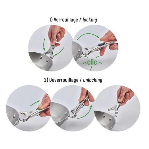 Son système d’accroche simple permet une manipulation à une seule main, rassure grâce à son ‘click’ de verrouillage et permet des gestes de cuisine en toute sécurité. Ses deux points d’accroche sur l’ustensile apportent de la stabilité.