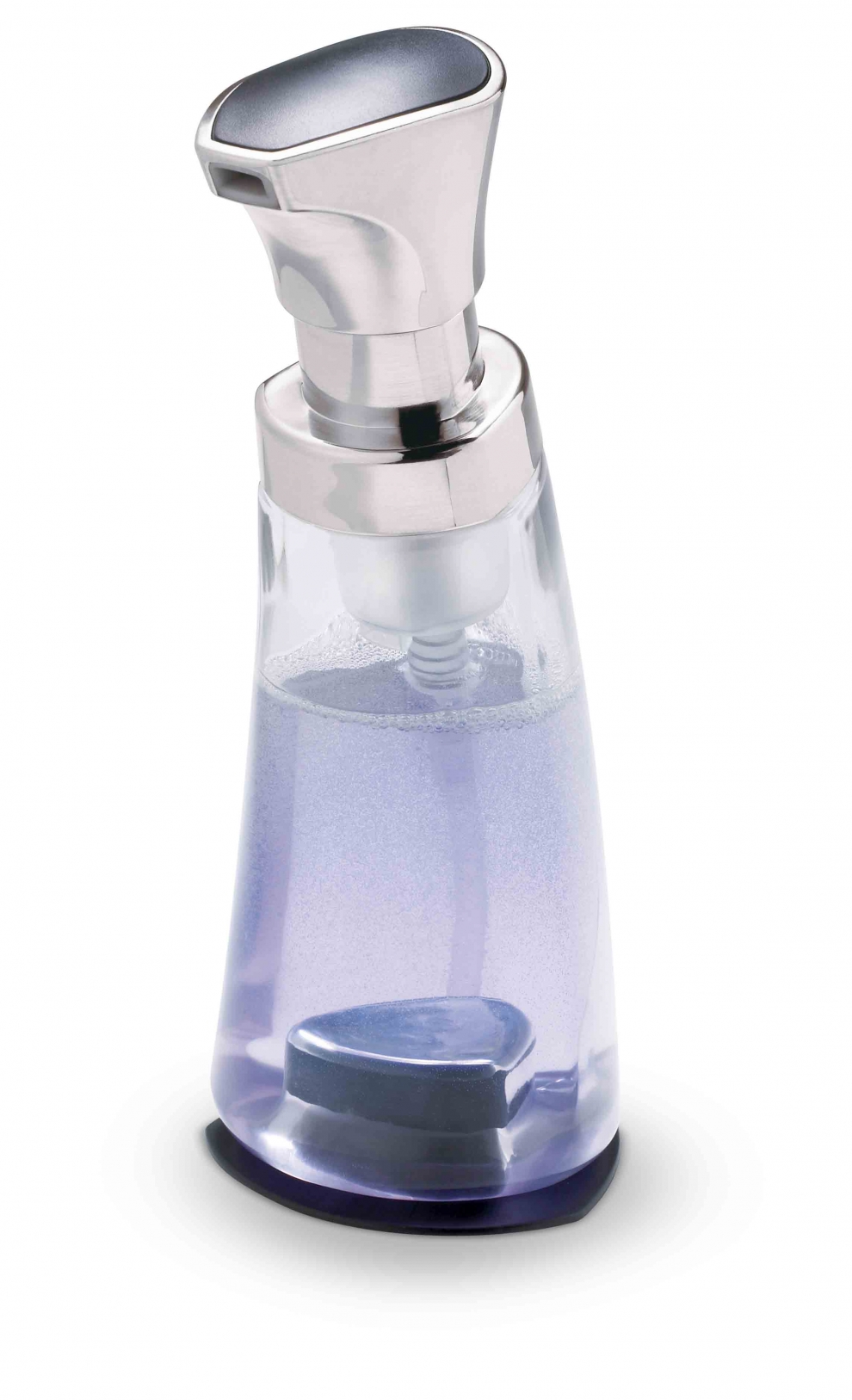 La ventouse au bas de la pompe maintient celle-ci en place. L'angle ergonomique permet une utilisation facile d'une seule main et évite de faire couler de la mousse à côté.