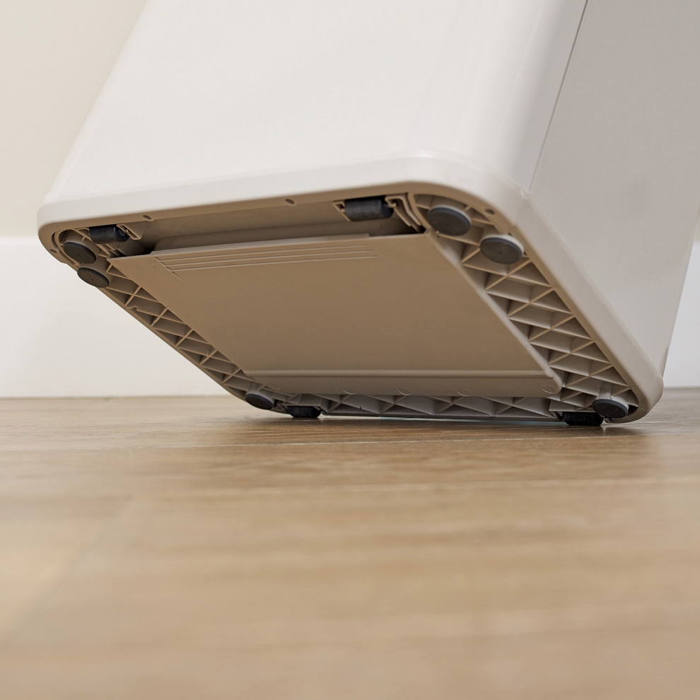 - Grâce à sa base à roulettes, la poubelle se déplace facilement dans la maison sans laisser de traces sur le sol.