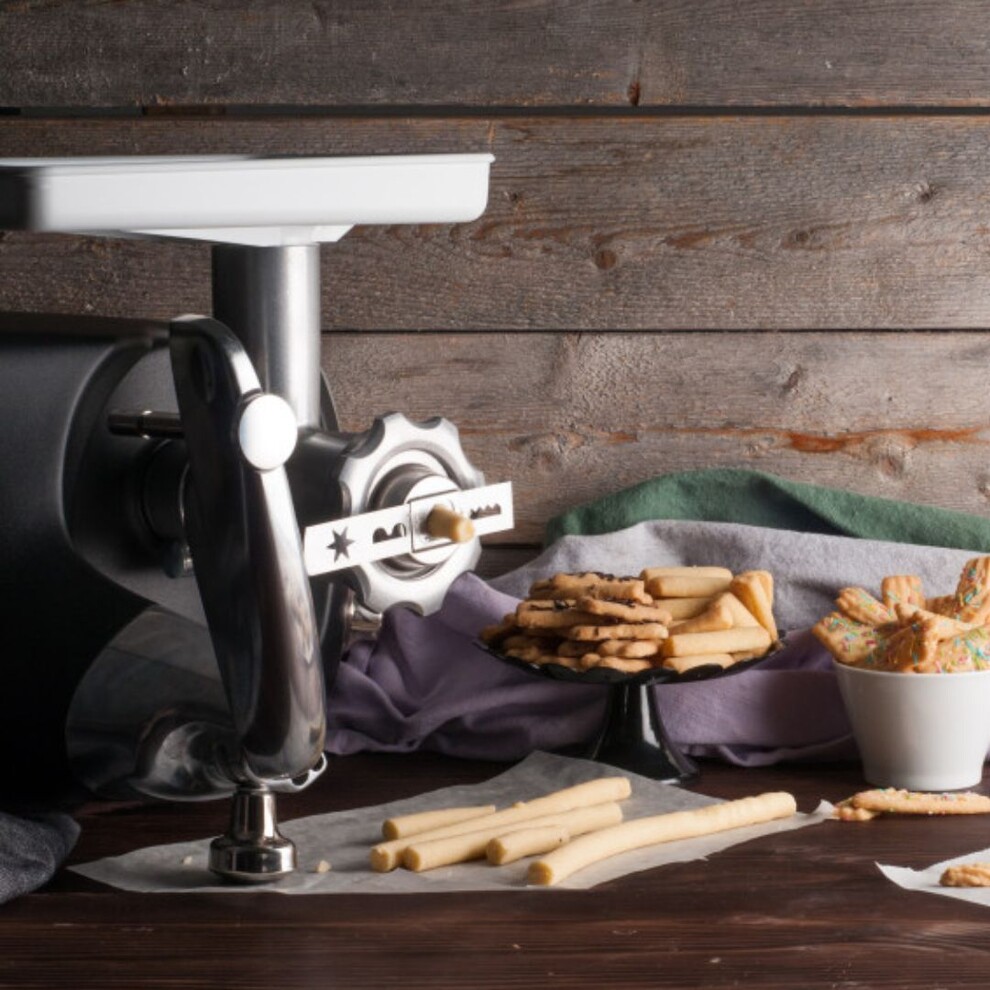 La presse à biscuits pour le robot Ankarsrum Assitent s'adapte sur l'accessoire hachoir.