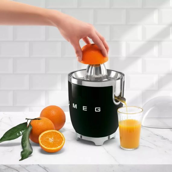 Ce presse-agrumes à pression manuelle de style années 50 est doté d'une puissance de 70W.