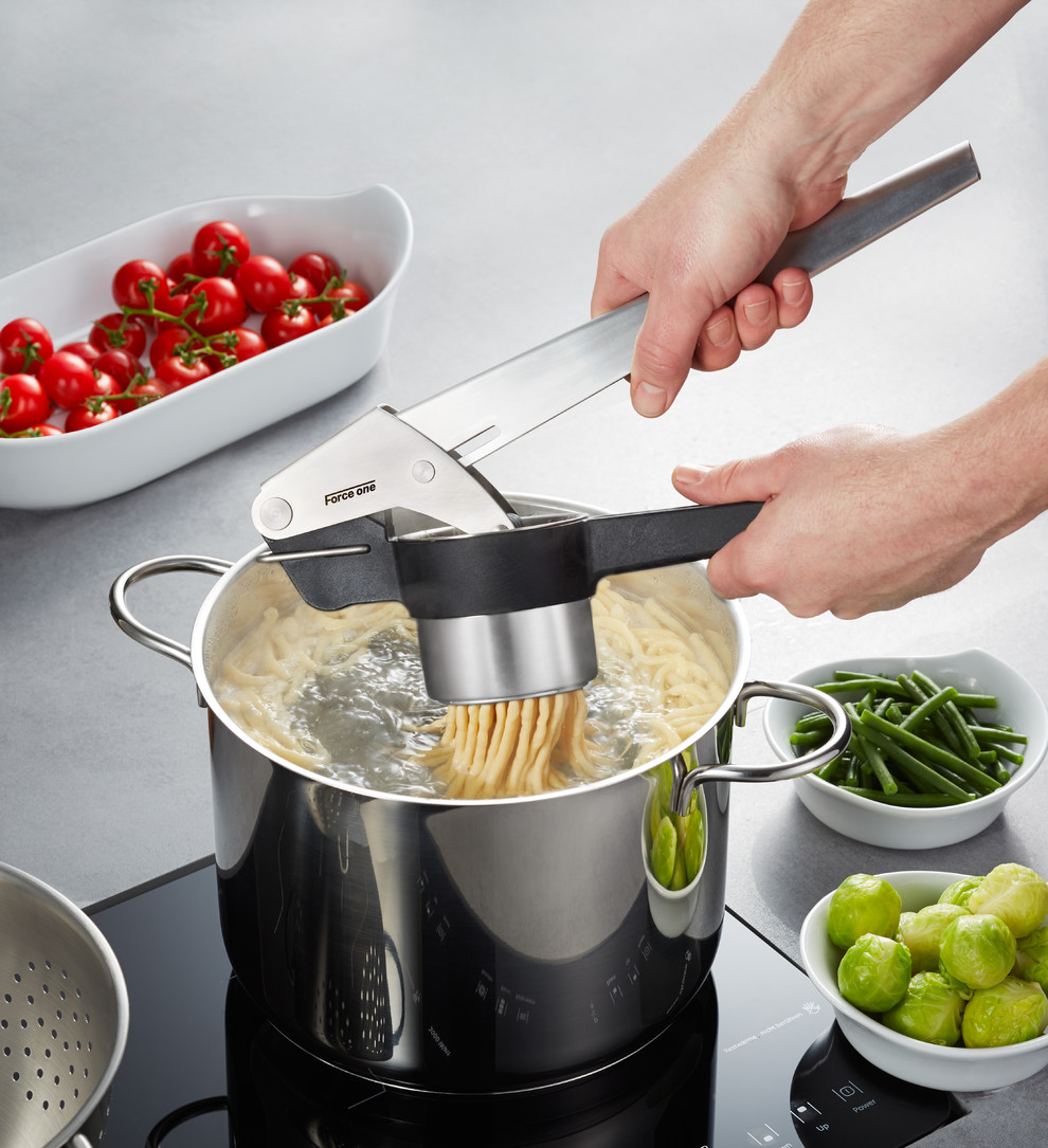 Avec le presse pomme de terre, fruits et spaetzle FORCE ONE, réalisez des spaetzle faits maison, une purée fine ou un jus de fruits frais. La position verticale permet de s'en servir directement au-dessus d'un récipient. Conçu en inox de qualité supérieure et en nylon, il est très résistant.