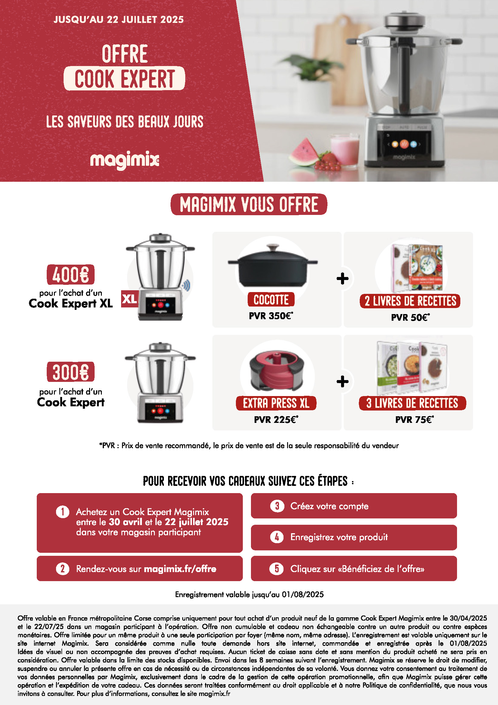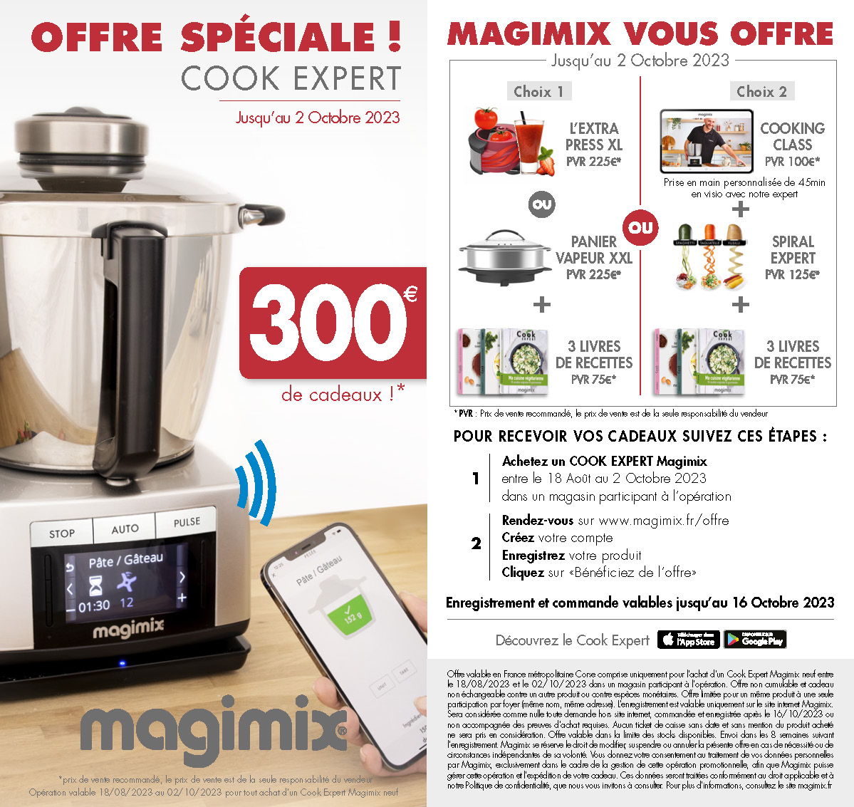Pour vous inspirer, un très beau livre de plus de 300 recettes détaillées est compris avec votre Cook Expert. Édité chez Marabout, le spécialiste des livres de recettes de cuisine, il vous guidera de l'entrée au dessert, par des recettes expliquées pas à pas pour faciliter la prise en main de votre nouveau robot culinaire.