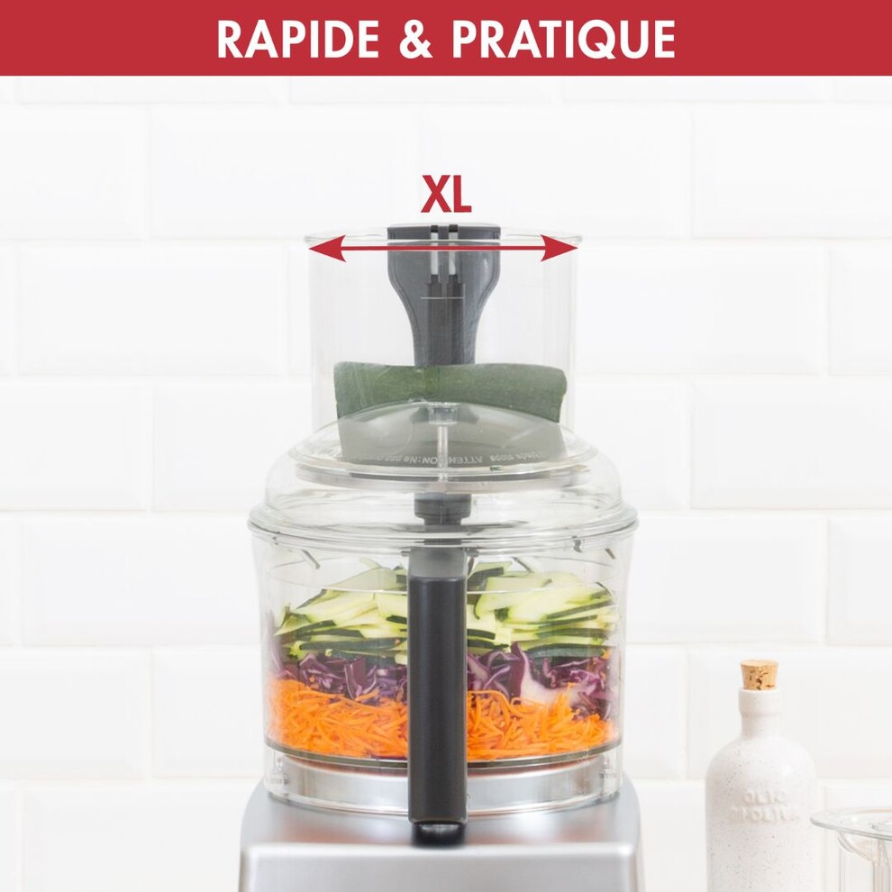 - Goulotte Extra Large : Pour émincer , râper et réaliser des bâtonnets de fruits et de légumes entiers ou en gros morceaux, élargissant les possibilités de préparation.