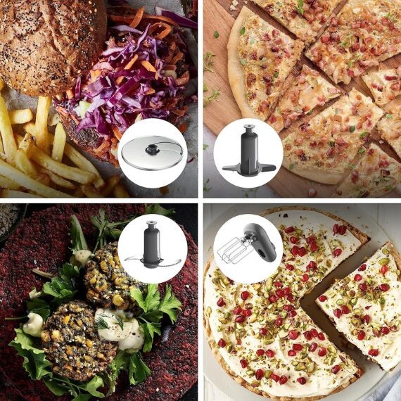 Vous disposerez également d’un couteau en acier inoxydable, un presse-agrumes, d’un kit pâtisserie (pétrin, double fouet métal, spatule) ainsi que de 5 aux différentes dimensions pour râper et émincer, réaliser des juliennes et des frites.