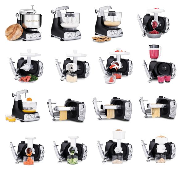 Faites bien plus que pétrir avec votre ANKARSRUM, avec ces 16 fonctions différentes à l'aide de ces accessoires, vous pouvez pétrir, mélanger, fouetter, émincer, râper, presser, former des pâtes, couper et bien plus encore !