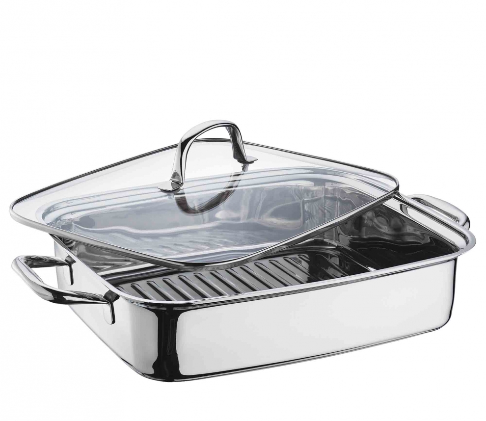 Rôtissoire ' Cuisson & Service' en inox avec couvercle en verre - 38 x 28 x 8 cm