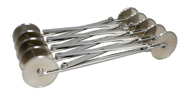 Le rouleau découpeur à 5 lames « bicyclette » est utilisé pour couper plusieurs bandes de pâte simultanément.