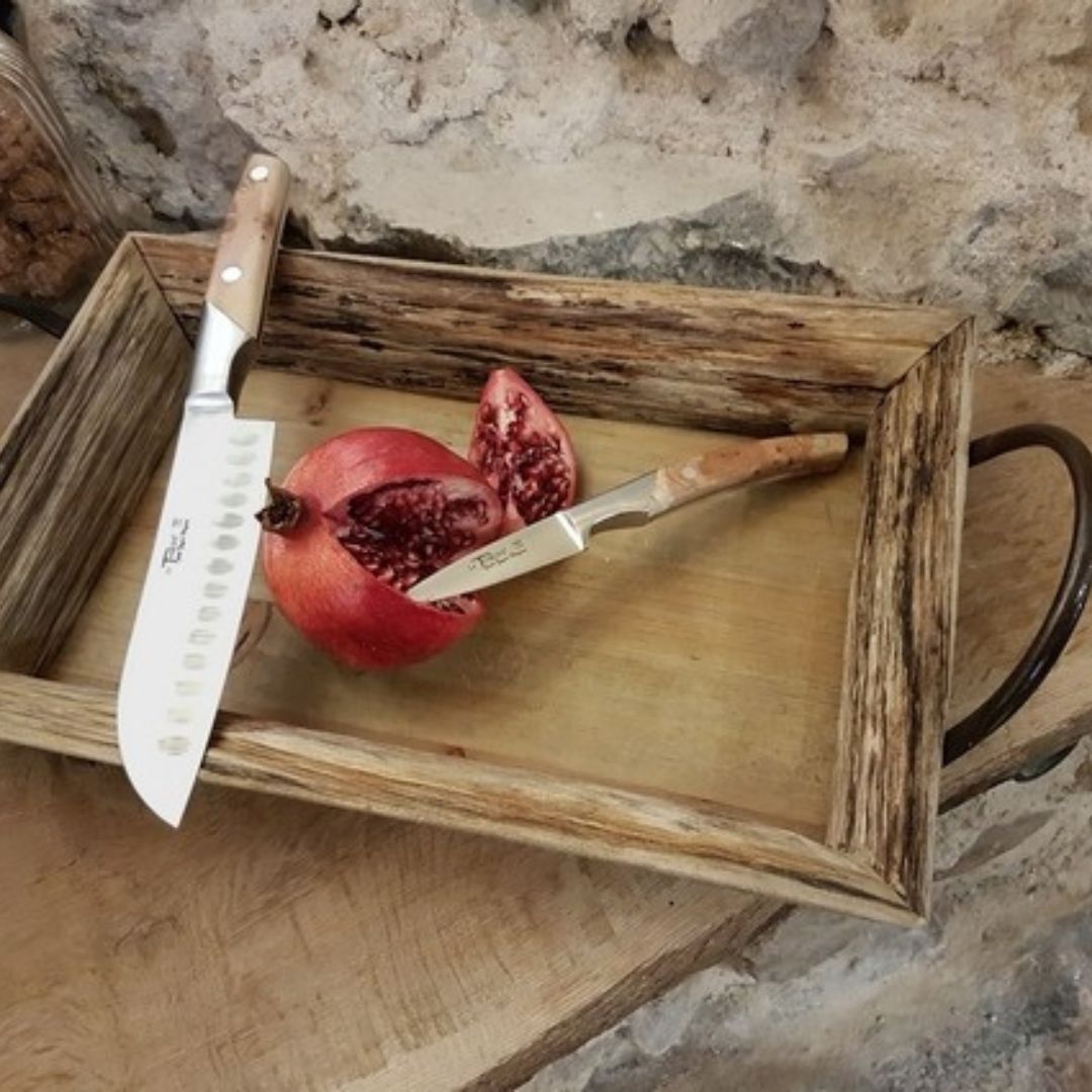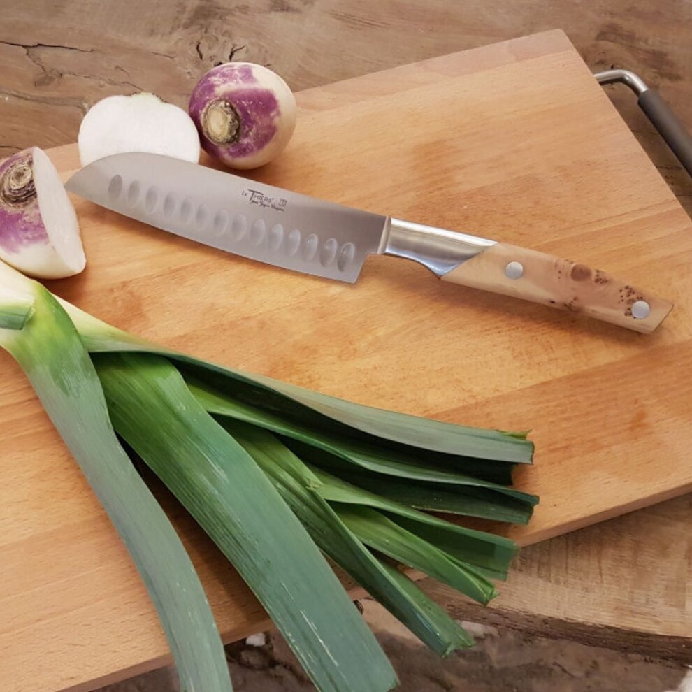 La collection Le Thiers Cuisine réinvente le design du célèbre couteau Le Thiers pour répondre aux exigences de la préparation culinaire. Ce couteau japonais Santoku est idéal pour découper viandes, poissons et légumes avec précision.