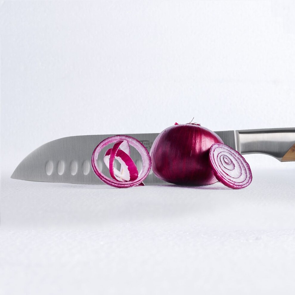 « Santoku » – Ce couteau de chef japonais, dont le nom signifie « trois bonnes choses », est conçu pour exceller dans trois domaines :