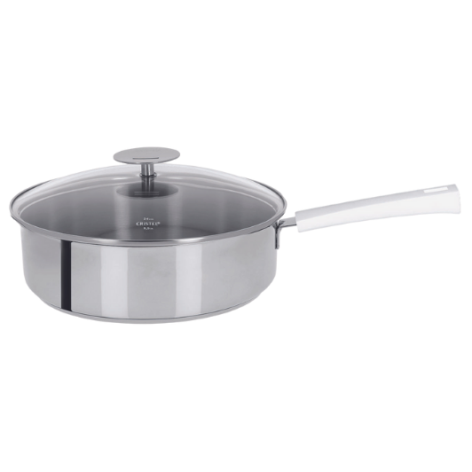 La sauteuse ø 24 cm tout inox revêtue de l’anti-adhérent Exceliss et son couvercle en verre bombé et inox de la collection Mutine à poignée fixe blanche