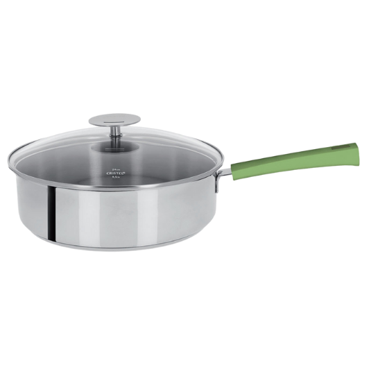 La sauteuse ø 24 cm tout inox revêtue de l’anti-adhérent Exceliss et son couvercle en verre bombé et inox de la collection Mutine à poignée fixe verte tilleul