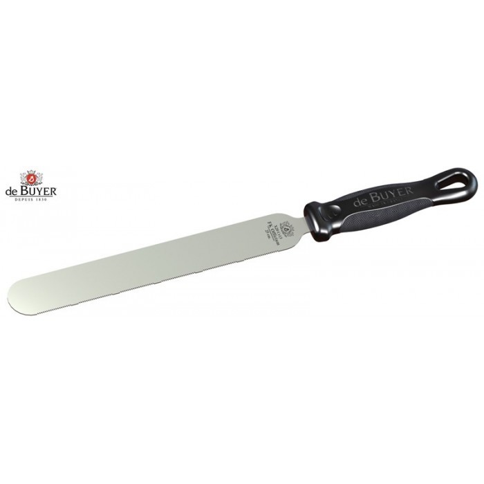 La scie à génoise permet de découper à l’horizontale la génoise de manière régulière et sans brisure afin de garnir ensuite le gâteau de crème ou autre. Sa surface polie facilite l'étalage et évite la corrosion.