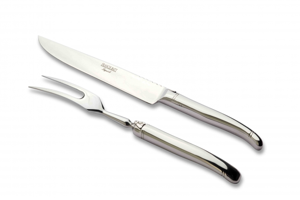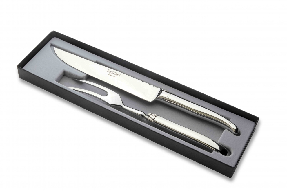 Ce set de 2 couverts de service en inox est composé d’un couteau à découper Laguiole et d’une fourchette de service Laguiole à 2 dents.